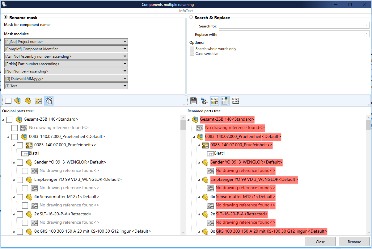 - Regelbasiertes Umbenennen von Teiledateinamen, Baugruppendateinamen und deren abgeleitete Zeichnungsdateinamen.
