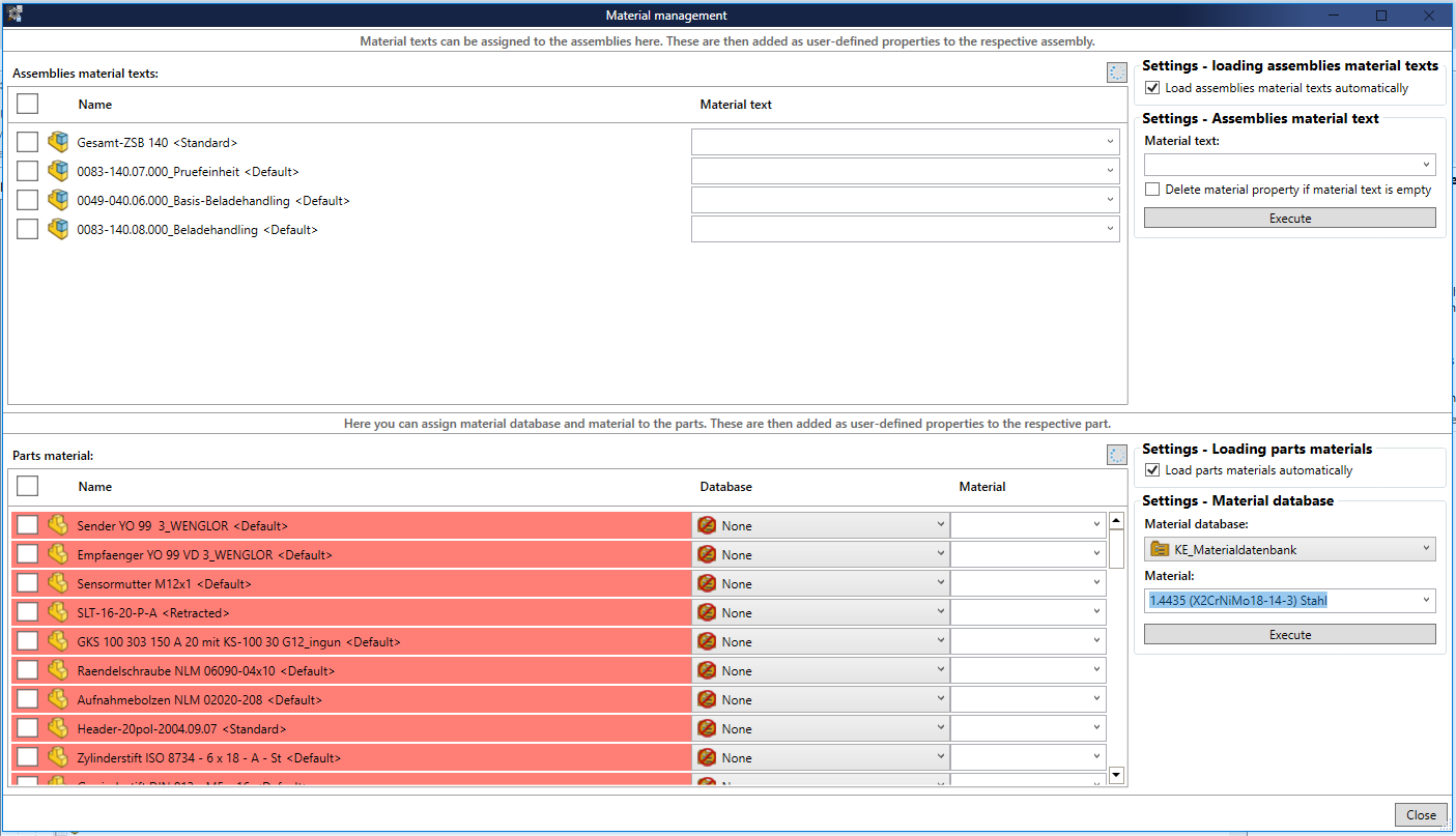 - Materialien aus den vorhandenen Solidworks Werkstoff-Datenbanken können gleichzeitig einer Auswahl von Teilen zugeordnet werden. Diese Materialien sind dann auch in Solidworks als Material hinterlegt, nicht als benutzerdefinierte Eigenschaft.